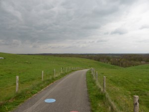 Bij een bordje dat verwijst naar een koffiekiosk, dienen we af te slaan en gaan de afvalberg op. Een asfaltweg voert naar boven, wel aan de voet van de heuvel een hek, met een bord dat het hier verboden is voor fietsers. Ik kan me niet voorstellen dat fietsers die een helling op willen zich hier door laten tegenhouden. Er zijn al zo weinig hellingen in ons platteland. De helling is berekend op kinderen want her en der staat informatie in de vorm van een puzzel. Voor de niet puzzelaars is de weg naar boven ook geschikt.