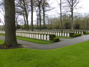 Aan de overzijde van de weg is de erebegraafplaats. Hier zijn gevallenen van de strijd van mei 1940 begraven. Wanneer in een voorzichtige regen aankom, ontmoet ik twee vrijwilligers die leerlingen van een school in Veenendaal begeleiden op hun ontdekkingstocht in dit historische gebied. Ik loop verder en kom in het gebeid van de Laarsenberg, een veel minder bekende berg dan de Grebbeberg. Ik daal af naar de Koppelbomen en de regen tikt gestaag verder op plaatsen waar getikt kan worden. De Koppelbomen is een open akker gebied en juist hier regent het flink. De berg ga ik weer op en ik kom vlak langs de hekken van Ouwehands Dierenpark. Nu moet ik op deze plaats bekennen dat de naam Ouwehand mij eerder doet denken aan rolmopsen dan aan dieren die bezichtigd kunnen worden. Onlangs zijn twee panda’s gehuurd (geleased ?) van China. Deze dieren zijn nog niet te zien, want zij worden voorlopig in quarantaine gehouden. Wel hoor ik gillende kinderen achter hekken. Ik weet niet of de panda’s daar gelukkig van worden. Inmiddels ben ik voor de tweede maal op de Laarsenberg en nu ga ik beginnen aan weer een afdaling. Aan mijn linkerhand ontwaar even van het pad af een kazemat. Bij de kazemat staan twee militairen in vol tenue die op geen enkele wijze de indruk wekken dat zij binnenkort deze kazemat zullen aanvallen. De kazemat is in 1939 gebouwd en draagt het nummer S-17 (niet te verwarren met S5). De sectiecommandant tijdens de slag om de Grebebberg was sergeant Th. G. de Kok. Op de middag van zondag 12 mei wordt de kazemat omsingeld en zelfs met twee zware mitrailleurs kan de strijd niet worden gewonnen. In de avond om 9 uur wordt door de bezetting van de kazemat de witte vlag gehesen en komen de Nederlandse militairen met geheven armen te voorschijn. Zij gaan in krijgsgevangenschap.