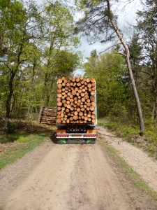 Bij de Elsterberg en de Noorderlaan tref ik een tweetal wandelbankjes en ik besluit hier weer een lunchpauze te houden. Deze Elsterberg haalt het niet bij de heuvel van de eenzame eik. Deze heuvel is maar liefst anderhalve meter lager. Het luistert nauw in een land met weinig verheffing. Er zijn niet alleen wandelaars en hardopers en honden op de been in het bos. Ook zie ik twee reeën die weglopen uit een gebied dat met linten is afgezet. Op de Westerlaan (zijn andere windstreken hier ook vertegenwoordigd ?) tref ik één boswerker aan. Oftewel een man aan de knoppen van een takel die kale boomstammen keurig op een vrachtcombinatie takelt. Er wordt niet op ouderwetse wijze met paarden gewerkt, zo te zien, om de gevelde stammen uit het bos te slepen.