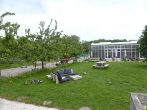 Wanneer we onder de Laan van Maarschalkerweerd door zijn gegaan zien we een klein bordje met de mededeling dat er naar 25 meter rechts iets is dat lijkt op een plek om te pauzeren. Het blijkt een bijzondere plek te zijn. Het is de Moestuin, een plek waar mensen op afstand van de arbeidsmarkt aan het werk zijn in het lunchcafé, de kas, het ontmoetingscentrum, de speeltuin en wat er al niet is (nog een houtwerkplaats) in deze ontspannen sfeer. We nemen buiten plaats op een grote bank (van steigerhout, inderdaad) en drinken thee (de warme chocola was op) en cappucino. We pakken de draad van de Kromme Rijn weer op en vervolgen onze kromme weg langs de Rijn. We gaan de A27 onderdoor en lopen het beroemde Amelisweerd in. Dit is het strijdtoneel geweest van een bezetting om het bos te behouden en ook nu is er weer de vraag of er nog iets van Amelisweerd af kan om de A27 te verbreden. We zijn nog maar net Amelisweerd in of we zien een ree, die zich heel langzaam uit de hoeven maakt en het struikgewas in gaat. Het lijkt er op dat het gracieuze dier wel vaker oog in oog heeft gestaan met tweevoeters.