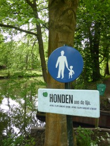 Soms levert een bord aardige gedachten op, onbedoeld waarschijnlijk. Honden aan de lijn en een bijpassend plaatsje van een (stief)(groot)vader en dochter. Het dochtertje kan aan de lijn? Of kan de rechterhand van de man nog een lijn vast houden met aan het andere einde een hond?