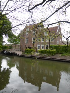 Wanneer een mens in Utrecht komt kan hij niet om de Dom heen. We komen niet langs de Dom, maar we hebben wel de gelegenheid om een blik te werpen vanaf de Oude Gracht. Hier pakken we het begin van de route op. Dat wordt duidelijk door de eerste markering die we aantreffen op een paal. We lopen in zuidelijke richting, langs een verscheidenheid aan allerlei soorten horeca en bijzondere winkeltjes. Zelfs een Museum voor Aboriginal Art komen we tegen. Hoe verder we naar het zuiden oprukken, hoe rustiger het wordt, niet wat betreft de variatie aan winkeltjes en dergelijke, maar gezien het aantal mensen. Zelfs op het Ledig Erf is het rustig. Er zijn meerdere plekken om te rusten en de benen te strekken, maar weinig mensen maken er op dit tijdstip gebruik van. Het Ledig Erf is een knooppunt van waterwegen. De Oude Gracht gaat hier over in de Kromme Rijn, het is een naadloze overgang, want het is één en hetzelfde water dat er stroomt.