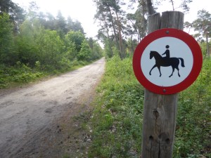Er zijn veel paden voor paarden, mits de ruiter een vergunning heeft gekregen en bij zich heeft. Dit brede pad is verboden voor paarden en ruiters te paard. Het is te merken aan de ondergrond die niet is omgewoeld door de paardenhoeven (trippel, trippel, trippel, trap). Aan dit voor paarden verboden pad ligt een verborgen kampeerterrein van de N.T.K.C. Een natuurcamping, met weinig faciliteiten, geen team dat de kinderen vermaakt, geen pyamadisco, geen patatkraam, gewoon een beetje rust in het bos. Het hele jaar mogen mensen hier hun tent opzetten of hun caravan waterpas neerzetten. Ik ben wel eens over het terrein gelopen tijdens mijn vroegere zwerftochten. Mijn tocht gaat verder, nu langs het Langeveen, waar de nattigheid nog is te zien. Wat ik ook zie is een klaphek met een roodgeel teken, ik vermoed van het Utrechtpad (waar we inmiddels de eerste etappe van hebben gelopen). Vlak na het klaphek neem ik op een omgevallen boomstam plaats, kijk om me heen en neem een lunch.