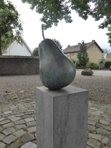 Aan de overzijde van het water komen we in het oude centrum van Cothen. Oude huizen en oude bomen. Ook staat op een sokkel een eerbetoon aan de peer. We zitten hier middenin een streek met veel, heel veel, fruitteelt. Ik neem aan dat de peer een centrale rol speelt in het leven van de Cothenezen, waaronder veel toffe peren. Bij het oude centrum hoort natuurlijk de dorpskerk, die dateert uit 1464. Er was hiervoor een kerk, maar die werd door plaatselijk geweld verwoest. De kerkgemeente hoort bij de Protestantse Kerk in Nederland. Na de korte tocht door het oude centrum komen we via het Zandpad aan de oostelijke zijde van het dorp. We volgen dit pad langs huizen en fruitbomen tot we bij de provinciale weg aankomen. Nog een een paar honderd meter en dan zijn we er.