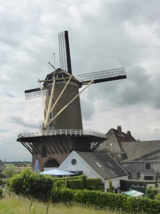 Via de oostelijke kant omsingelen we Wijk bij Duurstede, de oude Dorestad. Zo komen we bij de Oude Rijn en de plaats waar de Kromme Rijn begint, want in oude tijden stroomde het meeste water van hier naar Utrecht en verder naar Katwijk toe. Hier hebben we zicht op de nieuwe inundatiesluis, die dateert uit 1870. Van groter belang is natuurlijk de molen die hier vlakbij staat. Elke zichzelf respecterende gemeenschap zou een molen dienen te hebben. Maar daar hoor ik politieke partijen die ons erfgoed willen verdedigen nooit over. Helaas. We zijn al vaak bij deze Walmolen Rijn en Lek geweest. Het is aardig dat je onder de molen door kunt lopen en ik vermoed dat in oudere tijden paard en wagen hier onder door kon.