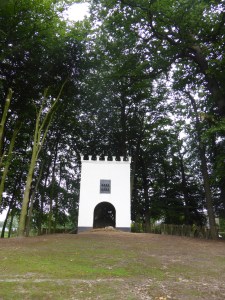 Wat ook nog is te zien is deze oude duiventil achter het kasteel. Ik heb geen duif gezien, maar wel schuilde een viervoeter onder de toren voor de regen. Ik weet niet of de duiventil gebruikt werd voor sierduiven of voor postduiven. Waarschijnlijk waren er toen reeds twitterende postduiven, die tweets overbrachten naar een ridder op een wit paard, of een jonkvrouwe eenzaam in een torenkamer.