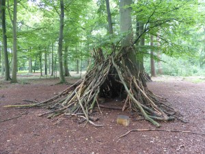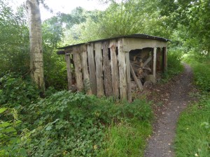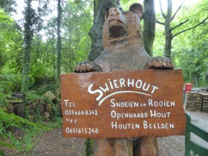 Wanneer het van boven weer droog is geworden ga ik verder. Maar onder is het nog niet droog. Ik kom over een zeer smal paadje omzoomd door struiken. Het lijkt wel of ik door een wasstraat loop. Tot aan Lage Vuursche en de parkeerplaats is het bos en bos en rustig. Ik stuit op het Koos Vorrinkhuis van de NIVON. Even later kom ik langs Swierhout, zo te zien kan iemand die het wil kunstige houtproducten hier kopen.