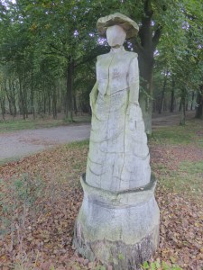 We komen niet alleen levende mensen tegen, een persoon is vorm gegeven in een fraai houten beeld. Is het een dame van koninklijke allure? Is het koningin-regentes Emma die hier in het bos wacht op de dingen die komen gaan en weg gaan? Eén van de ingrepen van de mens zien we bij een berceau, die nog in het stadium van groei is. Bomen vormen een boog, sommige bomen zijn iel en jong, andere bomen hebben de jaren van volwassendheid al bereikt. Vanuit het bos zien we aan het einde van een lange laan een naald, niet de beroemde Naald bij het Paleis Het Loo. Deze Naald is een herinnering aan de slag bij Waterloo (1815), waar een Oranje prins bij aanwezig was.
