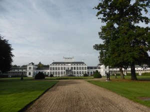 Wanneer wij verder gaan moeten we even de stramme ledematen op gang krijgen. Maar het lukt ons om Lage Vuursche te bereiken, het laatste gedeelte hier lopen we langs de beveiligde hekken van kasteel Drakesteijn. Alweer een koninklijk tintje op onze tocht. Na een korte pauze in dit dorp gaan we verder in westelijke richting. Blijkbaar woont er in Lage Vuursche een liefhebber van het edele golfspel, want een poort is fraai versierd met een hek met een golfspeler die door de knieën gaat om de bal een mep te geven.