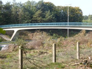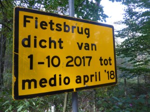 We komen op de Karnemelksweg. Op de Vuursche Dreef gaan we niet rechtdoor naar het station van Hollandsche Rading, maar we volgen het fiets- en wandelpad, dat ons over de snelweg A27 zal leiden. Het is een gelukkige greep, want we komen een bord tegen dat ons er op wijst dat we de volgende week hier de weg niet meer kunnen oversteken. Een purist zou nog kunnen denken dat alleen de fietsbrug zal worden gesloten en niet de wandelbrug, maar aangezien die beide bruggen gebruik maken van het zelfde wegdek is het goed mogelijk dat een wandelaar er ook niet door kan.
