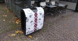 althans als vaste route. Spakenburg, onze startplaats, is bekend om de combinatie met Bunschoten (de vissers en de boeren), vis, natte koek, klederdracht en de vele kerken. Iets van die klederdracht zien we op het terras van de Kraplap. Er zit geen dame in, maar het geeft wel een beeld, ver buiten het dorp zien we een dame in klederdracht ons voorbijfietsen. In het dorp zien we meer de huidige klederdracht: de spijkerbroek.
