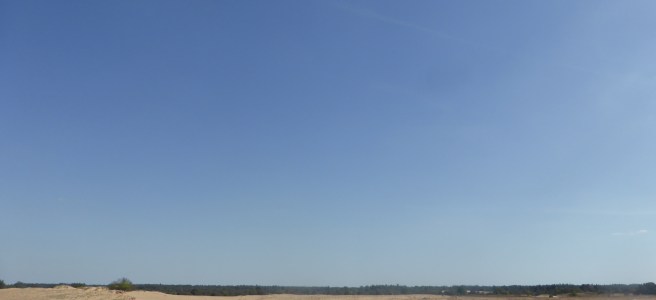 De vernieuwde route is bedoeld om door het Kootwijkerzand te komen en dat is zeer geslaagd. Ook hier is het stil, zeer stil. Een enkele keer hoor ik het geluid van een verre motor, waarvan de berijder de gashendel uitprobeert. Ik zie geen fietsers. Ik zie geen wandelaars. Het zand ligt uitgeput en droog op de grond. De zon straalt aan de hemelkoepel. Nauwelijks een schapenwolk te zien. Ik stap voort door het mulle zand en probeer zo veel mogelijk vaste grond onder mijn voeten te krijgen. Ter hoogte van De Dikke Bart (nee, dit is niet de naam van een wandelaar die ik tegenkwam) ga ik naar het bos aan de rand van Kootwijk. De schaduw doet mij goed.