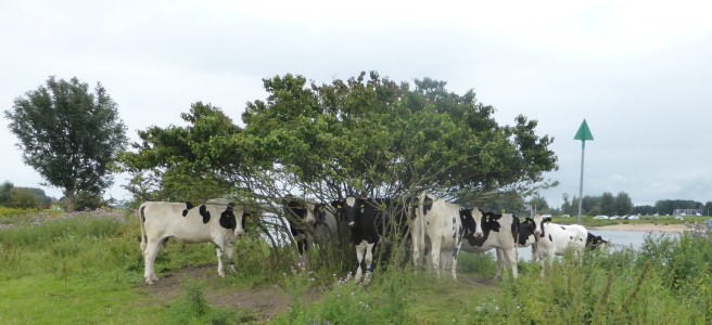 Zonder dat ik er van te voren op heb gelet is hier langs de IJssel het broedseizoen net een dag of twee voorbij. Dat betekent dat ik de afstand naar het veer (voor auto, fiets, voet) naar Wijhe grotendeels langs de oever van de traag stromende rivier door dit oneindige landschap kan volgen. En dat is meer dan de moeite waard. Een groep koeien zoekt rust onder een boom, ganzen lopen her en der, er bloeit van alles en nog wat, af en toe vaart een boot op de rivier. Dat dit pad tijdelijk was afgesloten is te merken bij het hekje dat mij op het asfalt bij het veer brengt. Hier is een uitbundige begroeiing ontstaan. Terwijl vogels aan het broeden waren, grepen deze groene groeisels hun kans en groeiden vrolijk verder.