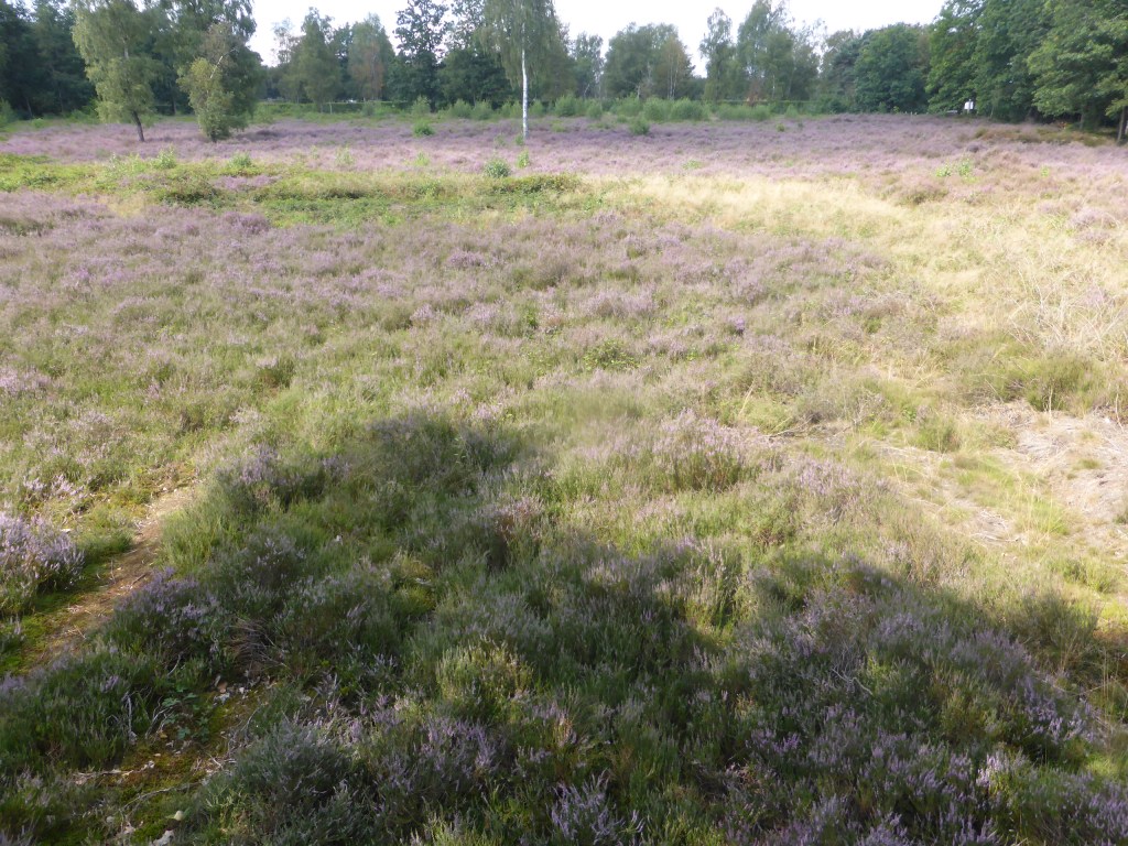 De eerste heidevelden passeer ik, kleine velden, die op weg zijn naar volle bloei. Eerst in de buurt van een natuurlandbouwgebied (een mooie combinatie : natuur + landbouw; blijkbaar is op veel andere plekken die combinatie er niet). In de buurt van de Dikkenberg wordt het een tikkeltje drukker, nauwelijks met wandelaars, maar eerder met fietsers en en een enkele auto die op weg is naar een riante woning in het groen.