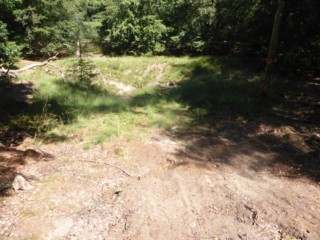 Dan ben ik er. Eerst kom ik nog drie bos-bikers tegen, die voor mij aan de kant gaan. Ik ben in een droog beekdal waar een pad zich doorheen slingert. Dat zal ook wel moeten want het beekdal slingert ook. Het lichte zand licht op in de stralende zon. Links en rechts van mij houden de hellingen mij gezelschap. Berkenbomen houden de wacht en op de hellingen bloeit de heide. Het is stil in dit oude beekdal van de Molenbeek, die ik tegenkwam toen ik vorige week door het Renkumse Beekdal liep. Dit dal ligt verder naar het zuiden. Hier is het prachtig! Dit dal is het hoogtepunt van deze wandeldag. Ongeveer een kilometer lang slinger ik mee met het pad.