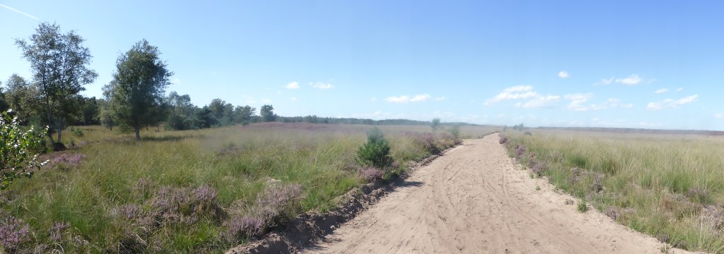 De heide is inderdaad groot en stil en wordt doorkruist door brede zandwegen met veel mul zand. Ik begrijp waarom ik op deze wegen geen andere wandelaars tegenkom en fietsers al helemaal niet. Waarom door het zand ploeteren wanneer er een vlak fietspad is dat naar de Hapcorner gaat?!
