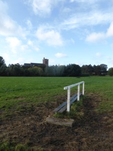 De weg brengt mij verder langs de bebouwde kom van Oostendorp, waar juist het seizoen voor hondenuitlaters is begonnen. Wat zou een hond betekenen voor de sociale cohesie in een gemeenschap? Mensen maken een praatje. Ik hoor een vrouw vragen aan een man hoe het is gegaan met de scan. De man antwoordt terwijl de honden dartelen dat de chirurg verbouwereerd was. De rest ontgaat mij en gaat mij ook niet aan. Inmiddels zie ik geknotte toren van de Grote Kerk van Elburg. Vlak voor het Van Kinsbergen College sla ik de polder in. En dan komt een heel leuk traject door de weilanden en over slootjes. Dwars door het open schootsveld vanaf de muren van Elburg. Gelukkig kan ik nu zonder gevaar voor eigen leven hier lopen. Wandellief en ik liepen hier eerder op het Zuiderzeepad. Toen was het nat en nat en drassig. Tijden zijn veranderd, zo ook de huidige ondergrond. Zeven vondertjes ga ik over, het is een oud kerkepad. Ik kom uit bij de gracht van Elburg die ik volg tot de Havenstraat en de Vischpoort.