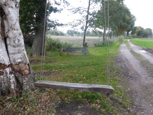 Wanneer ik de lus uit ben ga ik naar het westen en kom over de Berghuisweg, een breed zandpad in het agrarisch gebied. Een schommel en een bankje zien er uitnodigend uit. Ik kies voor het bankje. Wanneer ik een boterham eet en thee drink komen twee dames vergezeld door vier stokken aan over het zandpad en ik nodig hen uit om de schommel te nemen. De dames weigeren vriendelijk en gaan stokkend verder. Ter hoogte van Westeneng buigt het pad naar het oosten. Wanneer ik bij de Pijnenburgweg kom maakt het pad een klein ommetje om een vrijstaand huis door resterende houtwallen en langs een poel. Aan de andere kant van de weg zitten twee dames met vier stokken op een bank.