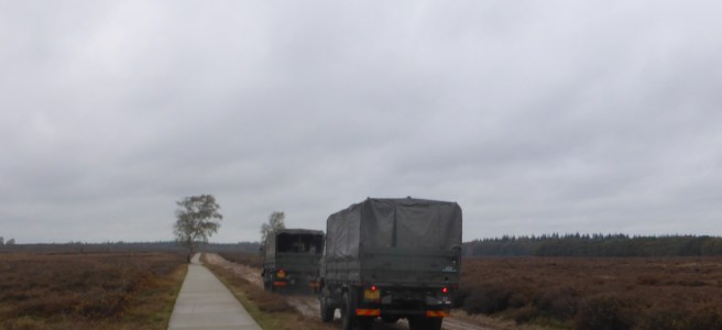 Ik verlaat de historische omweg en loop verder over het fietspad dwars over de heide. Aan mijn rechterhand ligt een breed zandpad opzichtig versierd met grote plassen regenwater. Twee legertrucks komen mij achterop rijden over het zandpad. Achter in de eerste truck zitten militairen in vol ornaat. In zo’n voertuig heb ik ook wel eens gezeten, op weg naar een schietoefening. Mijn Uzi bij de hand.