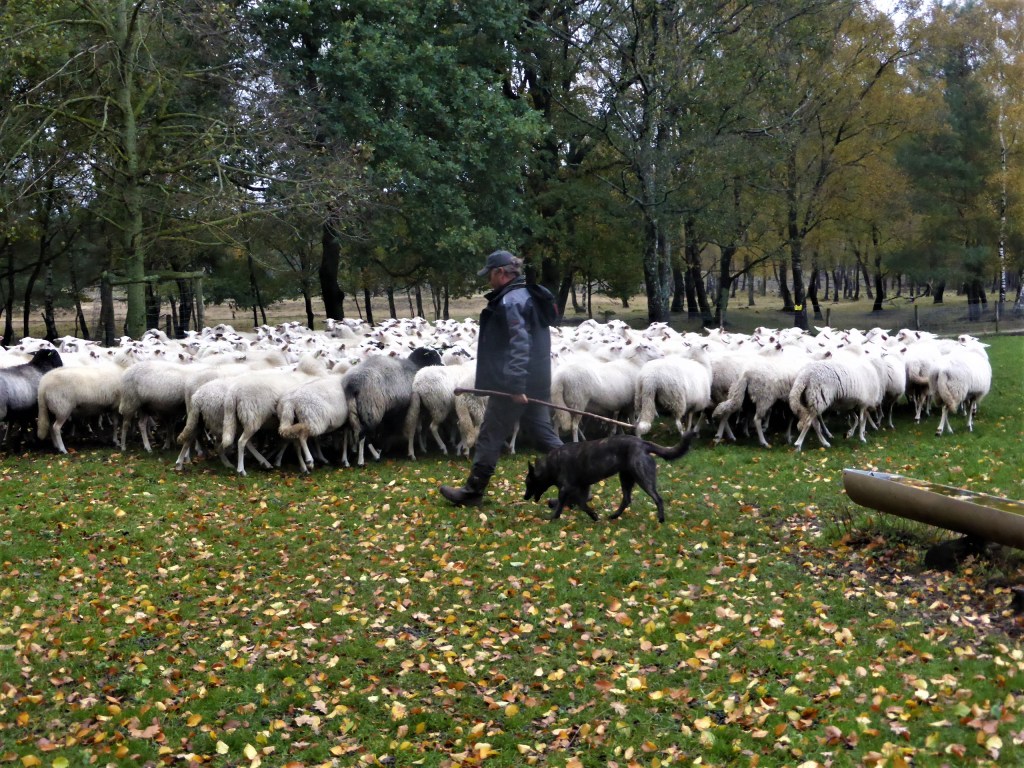 Dan kom ik bij Mossel. Ik kom er tegelijk aan met de herder en zijn honden. Hij haalt de schapen, die zijn gelegerd op Mosselsche Legerveld, op voor een ommetje. Eerst het ene hek open en daar gaat de kudde door. De schapen hebben mij in de gaten, soort ziet soort, en blijven ver van de heining. Dan gaat het eerste hek dicht en het tweede hek open. De honden rennen met georganiseerde bewegingen rond de kudde om de schapen de juiste richting op te bewegen. Dat gaat de beide honden goed af.