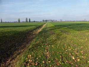 Hier loopt de Weidijk. Op deze weg ontmoet ik fietsers en wandelaars en hardlopers, weiden en fruitbomen onder een afdak. Vlak voor de Zijdvang ga ik het groen in. Een grote vlakte gevuld met gras en doorsneden door een droge greppel. Hoeveel vierkante meters zijn dit wel niet? In de verte zie ik een kudde zwanen en een koppel ooievaars. De ooievaars stijgen op. De zwanen vliegen zonder subsidie niet weg. Aan het einde van het grasland steek ik een smal bruggetje over (een typisch klompenpadbruggetje) en ga rechtsaf de Haarwal op. Ook hier weer fietsers en hardlopers en een enkele wandelaar. Hoewel de Haarwal een asfaltweg is komen er weinig auto’s voorbij. Links en rechts is er veel gras, kort gras. Ooit werd hier veen ontgonnen door de boeren die op de flanken van de hogere gebieden woonden, zoals de Grebbeberg en de Wageningse Berg.