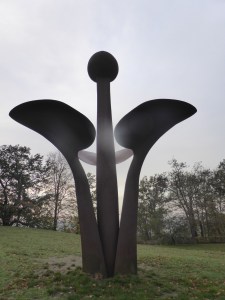 De start is bij een hotel op de Wageningse Berg, waar zo te zien geen gebrek is aan klandizie. De route gaat onmiddelijk tussen de bomen door en komt uit bij het beroemde Belmonte Arboretum. De naam geeft het al aan: een verzameling bomen op een mooie berg. Het park ligt aan de rand van een stuwwal en op meerdere plaatsen heb ik een fantastisch uitzicht op de Nederrijn en de Betuwe, alhoewel de verten versluierd zijn door nevels. Toch is het mooi en geheimzinnig, net niet eng. De tuin is er sinds 1954 op de plek waar ooit het landgoed Belmonte was. Tussen alle levende struiken en bomen van allerlei rangen en standen en oorsprongen staat er ineens een kunstwerk ‘Ontluikend leven’.