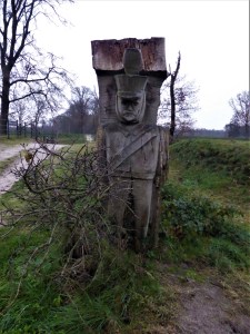 Dan rinkelt mijn telefoon, al pratend en luisterend wandel ik verder, rechtsaf het bruggetje over om dwars over het fort te wandelen. De houten soldaat groet mij vriendelijk en zwijgzaam. Het gesprek gaat verder en op en neer en ik wandel heen en weer. Verderop zie ik geen markering (wel van andere routes) en ik loop maar terug. Het gesprek is afgelopen en ik probeer mijn weg te hervinden. De markering wijst dwars over het fort, maar de route op de app wijst een andere weg, maar die blijkt dood te lopen. Dan toch maar de markering volgen en zien of ik nog een volgende tegenkom. De soldaat is niet bereid om verdere informatie aan mij te verschaffen. Het juiste paswoord ken ik niet. Fort Daatselaar ligt er trouwens mooi bij, als onderdeel van de Grebbelinie. Ik zie een aarden verdedingswerk dat omsloten is door een gracht. Al bijna 300 jaar oud is deze historische plek. Op de grens van provincie Utrecht en Gelderland loop ik over de Slaperdijk. Het is een mooie streep door het landschap, begroeid, historisch en met uitzichten ejn een enkele wandelaar met hond.
