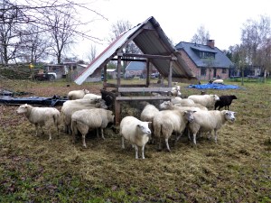 Dit klompenpad is genoemd naar de buurtschap Nederwoud (niet te verwarren met dat andere buurtschap in de buurt van Lunteren: Overwoud). In oude tijden was er een groot bosgebied dat zich uitstrekte van Woudenberg en Leusden naar Lunteren. Maar het Nederwoud is nedergehaald en van het Overwoud is niets meer over. Ik zie de schapen eten uit de ruif. Voor ieder is er genoeg, maar die wandelaar verstoort de aandachtige eter. Pas wanneer ik stilsta keert ieder terug naar het eten.