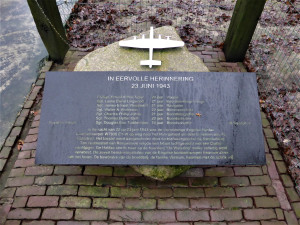 Via de Kerkstraat kom ik bij de Munikkenbeek, net voordat ik deze beek oversteek zie ik aan mijn linkerhand op het erf van een grote kippenschuur een monument. In de nacht van 22 op 23 juni in 1943 stortte een een Engelse Halifax bommenwerper, op weg naar het Duitse Ruhrgebied. Eerst werd dit vliegtuig, met zeven bemanningsleden (de oudste was 24 jaar), geraakt door luchtafweergeschut bij Soesterberg, toen kwam het in een luchtgevecht met een Duitse jager. Boerderij De Wetering werd de onverwachte landinsplaats van de Halifax, de boerderij werd volledig verwoest. Een klein monument van grote waarde.