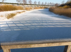 Van de Doornsteeg ga ik via een tunneltje (fraai vormgegeven) naar een bedrijventerrein. Het wandelpad loopt vlak langs de snelweg, waar nu beduidend meer verkeer is dan in april vorig jaar. Dan stuit ik op de Arkervaart. Er liggen ijsschotsen op het water, maar ik waag het er niet op om zo naar de overkant van de vaart te geraken. Was er niet in het fameuze boek ‘De negerhut van oom Tom’ (‘De Afro-Amerikaanse hut van oom Tom’) een scene waarin een moeder met kind via ijsschotsen naar de overkant van een rivier ging? Ik moet naar het zuiden om een oversteek te vinden, dat lukt bij de Ambachtsstraat waar ik een goed functionerende brug aantref. Op naar het volgende bedrijventerrein. De randen van de wegen hier zijn niet erg goed begaanbaar. Ik hoop op attente chauffeurs die opmerken dat ik op het weggedeelte loop. Zo ruk ik op naar de grens met de gemeente Putten.