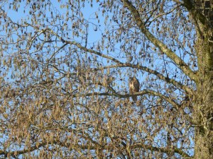 Langs de drukke Berencamperweg (tja, deze komportalenwandeling volgt niet altijd de fraaiste stukjes van ons stadje) kom ik bij de Vetkamp. Links bij de rotonde naar Putten, rechts Nijkerk in. Ik sla rechtsaf en verderop linksaf. Op de hoek van ’t Hazenveld en de Wallerstraat zie ik twee dames aan de overzijde van de weg naar een boom kijken en wijzen. Zij lopen dichter naar de boom toe. Ik ga ook maar eens kijken. Wat blijkt? Er zitten twee ransuilen in de boom. Eén van de dames weet mij te vertellen dat er meestal drie ransuilen in deze boom zitten. Op de foto is één van de ransuilen te zien. De andere zit een paar takken lager, waar nummer drie is weet ik niet. Waarschijnlijk is die gevlogen. Net wanneer ik de pas er in zit om de Wallerstraat verder te verkennen spreekt een jongeman op een fiets mij aan. Hij woont hier in de buurt en komt meerdere keren per dag langs dit punt. En telkens ziet hij mensen kijken en fotograferen. Wat is er aan de hand? Ik vertel hem over ransuilen en hij kijkt en ziet! Zo is het ook voor hem toch een mooie dag geworden. Hij wenst mij een fijn weekend.