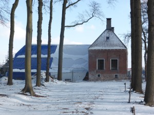 De Wallerstraat gaat over in het Bloemendaalseweg. Wanneer ik het spoor tussen Nijkerk en Putten oversteek loop ik het buitengebied in en de zon schijnt nog steeds. Links zie ik weer een komportalenbord en ik ga verder. Van de vorige rondgang herinner mij dat er druk werd geknutseld aan het grote huis van Groot Hennekeler. Nog steeds wordt er aan gewerkt, nu zie ik zelfs mensen die aan het werk zijn. Met dit tempo kan ik volgend jaar nog eens mijn ronde doen en zien hoe het verder gaat. Over een smal paadje loopt ik op de grens van voetbalvelden en weilanden. De sneeuw glimt in de zon. De grasmatten van Sparta Nijkerk gaan schuil onder een witte laag. Hier wordt voorlopig niet gevoetbald.