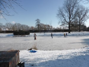 Bij Luxool staat een andere kapitale boerderij, maar deze ziet er uit alsof de restauratie wel helemaal af is. Ik kom weer tussen de huizen en volg de Oude Barneveldseweg. Op een vijver zijn jongeren en ouderen bezig om hun schaatskunsten te tonen. Een vrouw van middelbare leeftijd heeft twee witte kunstschaatsen onder. Zij zwiert dan op het ene been, dan op het andere been alsof zij niet alleen de sterkte van het ijs maar ook de sterkte van haar enkels wil testen.