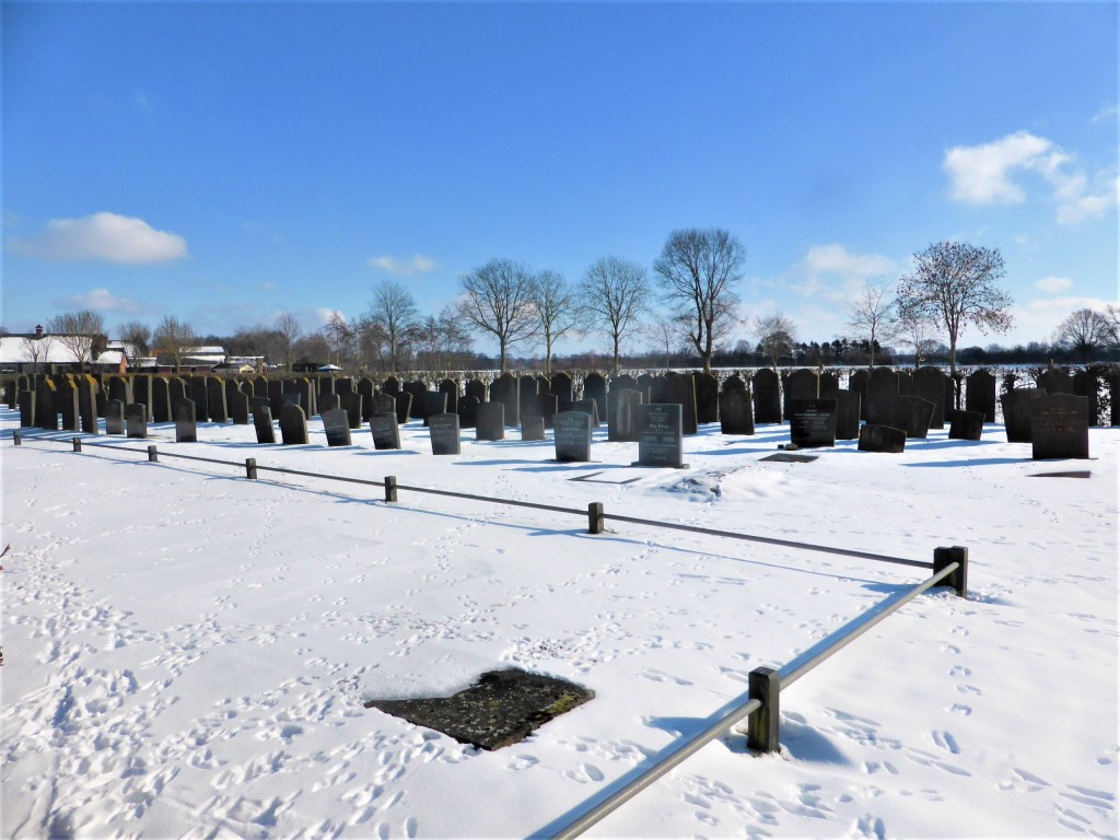 Via de Slichtenhorsterweg kom ik op de Oude Amersfoortseweg, waar doorgaand verkeer niets te zoeken heeft. Een paard steekt voor mij dwars de weg over en stapt een weiland in. Het eerste meisje leidt het paard. Het tweede meisje draagt een slee. Het lijkt mij dat de slee te klein is om het paard te dragen. Met elke stap kom ik dichterbij wat misschien wel het best bewaarde geheim van Nijkerk is. De joodse begraafplaats aan deze weg, vlak voor het einde van mijn route. In 2020 is hier nog iemand begraven zie ik aan een steen die dicht bij de gesloten ingang ligt. Het hek markeerde lang, lang geleden de ingang van de plaatselijke synagoge. Een paar honderd meter hier vandaan loopt langs een drukke weg de route van het Westerborkpad dat geheel in het teken staat van de jodenvervolging. Maar zelfs dit pad komt hier niet langs. Ook het wandelen kent zijn raadsels.
