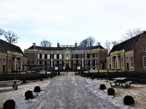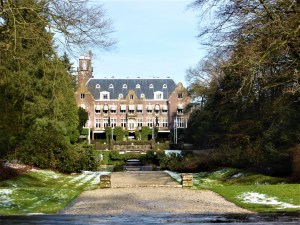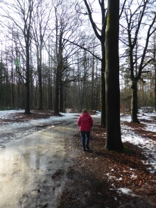 De start van de wandeling ligt aan de voorzijde van het station. Aan de achterzijde kunnen wij via een traploze afdaling naar beneden, de tunnel in, waar een poserende jongedame gefotografeerd wordt (het ene been van het model wat onnatuurlijk opgetrokken), de tunnel uit en dan via de linkertrap naar boven. Daar staat een leuk stationnetje dat (nog) niet ten prooi is gevallen aan de modernisering. Dan gaan we de Gerrit van der Veenlaan op. Aan de zijde van het spoor is een smal trottoir dat ontsnapt is aan de strooibrigade van de gemeente Baarn. De smalle stoep is glad en bevind zich op een hellend vlak. We gaan op de weg lopen, links lopen, veilig lopen. Gelukkig kunnen we na korte tijd links aanhouden en de groenvoorziening ingaan. ‘Gelukkig’ is wat voorbarig, want het blijkt dat de sneeuw wel zo’n beetje weg is, maar wat ons rest is een harde ondergrond met bevroren restanten sneeuw, strategisch geplaats tussen bevroren gesmolten sneeuw. Het is zoeken naar de juiste vervolgstap, soms is de smalle berm het beste, maar in die smalle berm hebben honden gehurkt gezeten. Dan gaan we een ruim opgezette woonwijk in en via het bonte gezelschap van Wilhelmina, Emma, De Beaufort (waar kom je die naam niet tegen?!), Waldeck Pyrmont en Jacob van Lennep komen we terecht in het bos. Hier zijn de paden niet gestrooid door de volijverige strooibrigade. Ook hier is het devies: kijk uit en loop voorzichtig. Door alle voorzichtigheid komen we uit bij Kasteel Groeneveld en directe omgeving (ooit het decor van Pipo de Clown). We hebben al een man ontmoet die de midlifecrisis nog niet heeft ontmoet, deze man heeft besloten om in gezelschap van zijn hond niet verder te wandelen., Het is hem te glad. Wat gaat er gebeuren wanneer die midlife crises zich bij deze man aandient?