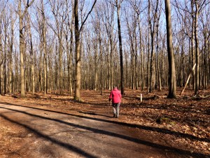 We komen door het Erfgooiersbos en hoe noordelijker we komen hoe kaler het bos wordt, dat wil zeggen er staan wel bomen maar de bodem kenmerkt zich door gevallen blad. Het is hier dan ook het Smithuyserbos, nou dan weet je het wel. Het pad slingert tussen de bomen door en om de bomen heen. Het pad en de genabuurde omgeving ligt vol met blad. Even goed kijken of je het pad volgt en niet de omgeving. Het pad is enigszins uitgesleten, wanneer je goed kijkt zie je dit in het landschap. Het is een spoor in dit cultuurlandschap. Gelukkig kan ik Wandellief goed volgen