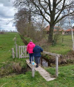 Den Velde? Ja, Den Velde! Het is een kleine buurtschap ten zuidoosten van Gramsbergen. We zijn hier verzeild geraakt, omdat we voor een paar dagen een buitenhuisje hebben gehuurd. Pal langs het erf van de voormalige boerderij loopt een wandelroute: het Lennips-pad. Kijk, zo’n kans laten wij ons niet ontnemen, vandaag gaan we op pad. Wandellief en haar jongste zus en ik. Drie mensen en een rollator.