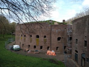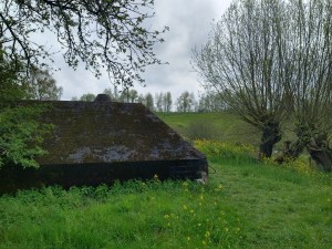 Wanneer de weg is afgelopen kom ik bij de eerste ontmoeting met de Nieuwe Hollandse Waterlinie. We zijn hier in Utrecht, niet in Holland. Zou het dan de Nieuwe Utrechtse (of Stichtse ) Waterlinie moeten zijn. Of duidt het ‘Holland’ in de benaming op de verdediging van Holland waar andere provincies zich aan ondergeschikt moesten maken? Dit is het Werk aan de Groene Weg en, warempel, er loopt een Groeneweg evenwijdig aan deze verdedingsstelling. Er zijn in dit gebied loopgraven, bunkers, schuilplaatsen voor de soldaten die Holland bewaakten. In de jaren 30 van de vorige eeuw zijn er op dit terrein veel fruitbomen geplant. Een passant zou haast denken: ‘Wat moet het hier mooi geweest zijn om op wacht te staan.’ Het is nog te vroeg in het jaar om een vrucht mee te nemen. Het zijn geen verboden vruchten.
