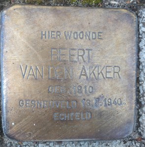 Ik steek de Bunschoterweg over en loop terug richting Nijkerk. Bij de Palestinaweg sla ik rechtsaf en loop de lange rechte weg in. Vlak voor de grens met de provincie Utrecht neem ik een pauze. In de zon en uit de wind en met mijn rug tegen een boom is het goed toeven. In de verte raast de A28. Ik zie het ooievaarsnest boven op een structuur die doet denken aan een ouderwetse boerderij. Hier in Palestina is het rustig. Aan het einde van Palestina loop ik langs de Laak, die op veel plaatsen scheiding aanbrengt tussen gemeenten en provincies. Ik wandel op de Domstraat, maar de Dom van Utrecht kan ik vanaf hier niet zien. Deze straat brengt mij, via Holkerveen, uiteindelijk bij de Amersfoortseweg. Daar ga ik naar het noorden om via enkele afslagen uit te komen bij de Joodse Begraafplaats aan de Oude Amersfoortseweg. Eén van de laatste graven is van Isaac Neiman (geboren te Shanghai 1943 en overleden te Amsterdam). Ik draai mij om en wandel terug naar de Van Dijkhuizenstraat en wandel Nijkerkerveen in. De steen bij nummer 75 heb ik snel gevonden. Hier ligt op het trottoir de struikelsteen van Beert van den Akker (29 jaar). Beert was van huis uit huisschilder en tijdens de mobilisatie legerkok. Een kwestie van de verfpot inruilen voor de kookpot. Hij was gelegerd bij een zuidelijk deel van de Grebbelinie. Daar werd hij dodelijk geraakt in de nacht van 12/13 mei 1940. Zijn laatste rust vond hij op de militaire begraafplaats Grebbeberg.