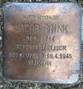 Ik steek de drukke Barneveldseweg over en een perceel van landgoed Oldenaller binnen, van daaruit loop ik zo de Deuverdenseweg op. Op nummer 19 woonde Jakob Brink. Hij was van beroep eierhandelaar. Waarschijnlijk heeft hij wel eens gebruik gemaakt van het Kippenlijntje van Nijkerk naar Barneveld (met een halte in Driedorp) om eieren naar de markt in Nijkerk of Barneveld te brengen. De lijn tussen Nijkerk en Barneveld werd in 1937 opgeheven. Op het adres van Brink stond een zender waarmee contact met London werd onderhouden. Op 16 april 1945 werd Jakob doodgeschoten door de Duitsers toen hij bezig was om de Engelsen te voorzien van wapens. Het duurde even voordat ik de struikelsteen vind. Heen en weer lopen, zoeken in de berm, uiteindelijk zie ik dat de steen ligt aan de de rand van de brede oprijlaan.