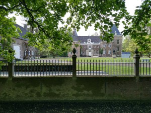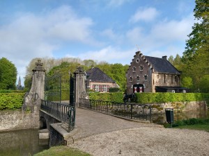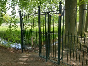 Na een rustige pauze, met heel veel vogelgeluiden, die ik uiteraard niet kan thuisbrengen, ga ik verder op de Velnerweg. Met enig doorstappen op deze slingerende onverharde weg kom ik op de Assendorperdijk, ook alleen voor wandelaars. Ditmaal op een ander landgoed. Een gezin met vader en kind (en ver achterop een ploeterende moeder) fietst met de vakantiebagage door de stukken met mul zand. Ik steek de Nieuwe Raalter Wetering over en kom op de Assendorperallee. ‘Allee’ was vroeger echt een woord uit de straattaal. En dan verschijnt aan mijn rechterhand een imposant hek met daarachter een wandelpad. Van tegenovergestelde zijde komen man en vrouw aan wandelen, die net voor mij bij het hek zijn. In het hek zit een draaideur met vier compartimenten. De man draait door het hek. De vrouw gooit haar rugzak over het hoge hek en komt ook door de draaideur, wat haar met de rugzak op niet gelukt zou zijn. ‘Heeft u nog hulp nodig?’ vraagt de man vriendelijk. ‘Het lukt mij wel.’ spreek ik optimistisch. Ik doe mijn rugzak af en probeer deze vast door de draaideur te krijgen, maar ik moet er meteen achteraan. Wanneer ik het ene deel van de draaiende deur vooruit duw om mijn rugtas er door te krijgen, drukt het andere deel al in mijn rug. En toch lukt het.
