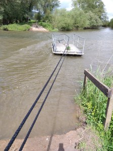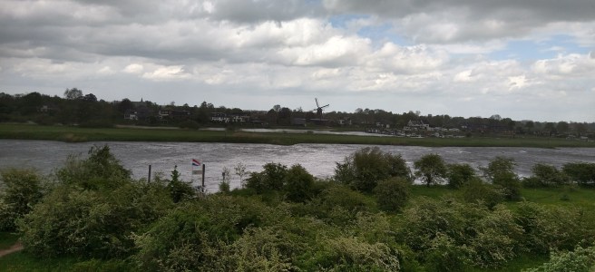 Het pad loopt enige tijd evenwijdig aan de Rijksstraatweg, om bij het zien van het eerste huis landuitwaarts af te buigen en dan … Een trekpontje. De ‘Wet van het Trekpontje” zegt: het pontje ligt altijd aan de overkant. De wind is sterker geworden. Een lichte regen houdt gezelschap. Ik stop mijn wandelgids in een waterdichte jaszak en haal het pontje over de golven naar deze zijde. Een kleine stap en ik ben geland op dit waterwaardige jacht. Nu ga ik de woeste baren op. De trekpont houdt zich kranig overeind. Aan de overzijde zie ik een waarschuwing aan een paal hangen. In dit jaargetijde kan het pad verderop (waar ik dus net vandaan kom) modderig zijn. Goed dat mensen achteraf worden gewaarschuwd. Nu loop ik langs de rivier der rivieren. Traag door oneindig landschap. Aan de overzijde van de stroom ontwaar ik Veessen. het veerpontje steekt van wal in Veessen en maakt de overtocht naar deze zijde. Ooit staken hier de Kozakken de rivier over in hun enthousiasme om het leger van Napoleon terug te drijven naar Frankrijk. Ter ere van deze Kozakken heet het veer nu ‘Kozakkenveer’. Ver voor mij uit zie ik een enkele wandelaar gaan. Verder zie ik ook donkere wolken en voel ik die felle zuidwesten wind in mijn gezicht. De wolken laten een deel van hun kostbare bezit naar beneden komen.