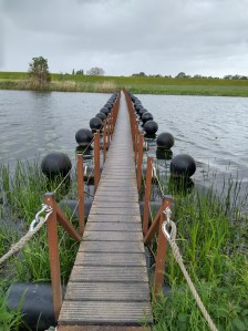 Nu ben ik alleen op pad. Een wandeling door de prachtige Duursche Waarden. Prachtig met laag water. Prachtig met hoog water. Ik ben niet de enige die hier zo over denkt. Wandelaars genoeg, met en zonder rugzak, met en zonder routebeschrijving, misschien wel bij het eindpunt van de Sallandse Zandloper. Mijn weg gaat ook over de wiebelbrug, die lang niet meer zo wiebelig is. Wel zo veilig. Dan over een dijk en door het open veld.
