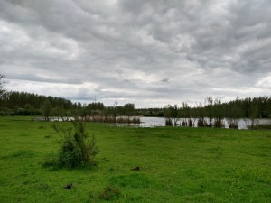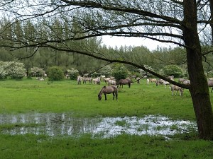 Aan de zuidelijke kant van de route is het landschap meer open, gras groeit tussen enkele bomen en struiken. Hier in het open gebied komen we meer wandelaars tegen op de modderpaden. We gaan naar het noorden langs de waterkant. In het natte gedeelte komen we een kudde Konikpaarden tegen. Jong en oud, man en vrouw. Rustig grazend, zelfs met vier poten in het water, een nieuw soort zeepaardjes. Een vrouw met lange telelens op haar camera houdt de camera tijden voor haar oog. Hopenlijk heeft zij mooie foto’s gemaakt, dan kan zij thuis zien wat hier te zien valt. Niet alleen de kudde paarden is vol van jong en oud, ook bij de wandelaars is dit concept waar te nemen. Een jochie loopt stampend heen en weer in een plas. Zo’n kind heeft geen belevingsbos of een kabouterbos nodig. In elk bos is een wereld te ontdekken, elke plas is een oceaan vol dromen.