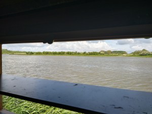 In de observatiehut staan drie mannen met verrekijker en camera die door de kijkgaten kijken naar het water en het riet en de vogels. Twee zwaluwen zitten op een plankje en observeren de mannetjes. Andere zwaluwen vliegen in en uit. Het is hier niet alleen een ‘to go’ maar ook een ‘to come’. We werpen een deskundige blik door de houten vensters en vermoeden van alles te zien. De drie mannetjes wisselen vogelnamen uit alsof het een kwartetspel is. Wanneer twee mannetjes zijn uitgevlogen blijft de derde achter, met zijn telelens uit het venster gestoken. Hij vraagt of wij de karekiet hebben gezien in het riet. Wij kijken deskundig naar buiten. Op het scherm van zijn camera laat hij een prachtige foto zien van een buizerd met gespreide vleugels. En dan …. roffelt met grote kracht een heftige regenbui op het water en het dak van de hut. Plots is de observatiehut een schuilhut geworden. Het is een goed moment om binnen te zitten.