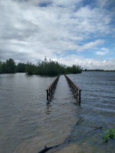 Na de spoorlijn kom ik in Ossewaard terecht. Dit gebied is ontstaan toen er een verbreding van de rivier (met name voor het water van de rivier) werd gezocht. Bij binnenkomst treft ik een paar koeien die grazen. Ik baan mij een pad door het struikgewas en na een tijdje stuit ik op een onbegaanbare pad. Het water is gestegen. Er zijn takken en boomstammetjes in het water gelegd maar die bieden mij geen houvast. Ik keer om en probeer mijn pad te hervinden. Ik vind een strook groen waar ik kan lopen. Even verderop probeer ik weer op de route te komen. In de verte zie ik de lange houten brug al liggen, maar wanneer ik dichterbij kom zie ik dat ook de brug mij niet welgezind is. Eerst door het water. Dan balancerend over één van de brugleuningen. Links lopen, veilig lopen. Het gaat niet op en ik keer terug naar de strook groen die nog droog is.