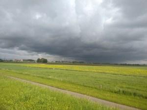 Ik ga terug via het Stadsland, een oud agrarisch gebied voor de bewoners van Deventer. De velden zijn nu kaal. Een wandelaar komt mij tegemoet en groet mij. Ik maak geen gebruik van de mogelijkheid om als extraatje naar de Hof van Twello te lopen. Daar is een blotevoetenpad. Mijn schoenen zitten goed en dat blijft nog wel even zo. Bij de spoorlijn ga ik over een dijk naar de Hoven, de woonwijk achter De Worp, de wijk waar voetballer en coach Bert van Marwijk opgroeide. De weg tussen de Wilhelminabrug (de brug uit de film ‘A bridge too far’) en Twello heeft een onderdoorgang die ik kan benutten, dan weer over een dijk. Wanneer ik in oostelijke richting kijk, zie ik zeer donkere wolken over Deventer trekken, eerst over de stad en langzaam naar het zuiden. Hier schijnt de zon in overvloed. Brengt de rivier scheiding aan tussen licht en donker? Mijn pad ligt bijna op de grens van Overijssel en Gelderland en de tocht heeft een provinciesprong gemaakt, zelfs een gemeentesprong. In De Steenenkamer word ik begroet door een kleine hond die enthousiast op mij af komt, zijn oude baasje vertelt dat zijn hondje met iedereen is bevriend. Het is een hondenleven met zoveel vrienden.
