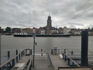 Ik sta op de aanlegsteiger van het electrische pontje over de IJssel, met het zicht op Deventer. De oude huizen aan de kade, daar hoog bovenuit torent de toren van de Lebuïnuskerk, wanneer ik naar rechts kijk zie ik twee ongelijke torens van de Bergkerk.