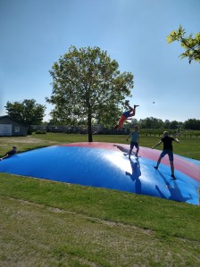 We dalen van de dijk af naar het buitendijkse gebied met bomen en zandstrand. Af en toe vangen wij een glimp op van het water van het Nuldernauw. Wanneer we bij een breed strand komen gaan we zitten om te kijken wat er gebeurt. Een man en een kind zitten aan de rand van het water in een campingstoel. Het kind gaat het water in en na enige tijd volgt de man, maar hij gaat niet ver. In de verte zien we een rijnaak die niet is verdwaald, maar wel ineens uit zicht verdwijnt. Anderen varen in een bootje of op een plank. De traagtijd van de tijd en de beweging komen hier voorbij. Een jong stel komt voorbij en komt terug. Mensen met hun hond vinden ruimte om te wandelen en te stoeien. Twee eksters doen zich tegoed aan achtergelaten eten, maar het duurt even voordat zij elkaar het licht in de eksterogen gunnen. Verder maar weer langs het strand. Huisjes met zicht op het water. Een kleine jachthaven. Een jongen maakt in snel tempo salto’s op een bijzonder springkussen. Misschien komt hij op tijd in vorm om mee te gaan naar de Olympische Spelen in Tokio. Twee jochies proberen de kunst af te kijken van deze grote knul. Onze route gaat over een camping, of is het een glamping, gezien de grote tenten met houten veranda die hier klaar staan. Over het pad dat vakantiepark en strand verbindt met Zeewolde lopen veel honden met aangelijnde mensen. We gaan de dijk op en lopen in de richting van waaruit wij kwamen. Het pad daalt de dijk af en verdwijnt in een bos. Plots is de route verandert in een kunsttraject. Het is allemaal niet direct als zodanig te herkennen, maar oefening baart kunst.