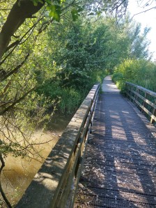 Wij gaan ook op pad. Minder, veel minder, zwaar beladen. Een verrekijker en twee camera’s, dat wil zeggen : een echte verrekijker en twee mobiele camera’s. Wij durven ons hier te vertonen, hoewel wij een minderheid zijn. Verder hebben we een drinkfles met water en twee appels bij ons. Ruimschoots voldoende voor de route die wij gaan lopen. Het is de Zeearendroute, dat zou kunnen betekenen dat wij op onze zonnige tocht een zeearend zouden kunnen waarnemen en wellicht ook herkennen. Ik houd mij er niet aan vast. We zullen vast iets zien en vast iets horen. Langs de winkel en horeca op het terrein gaan wij op pad, eerst een bruggetje in de schaduw met het geluid van vele vogels die zich ophouden in bomen en struiken.